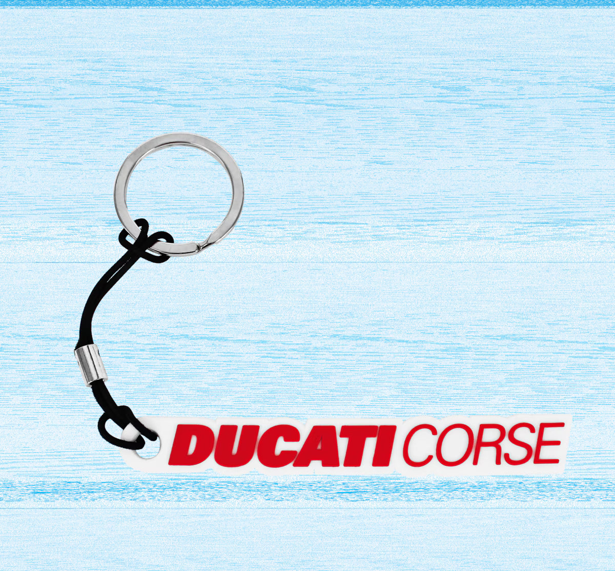 Practical rubber key ring with an embossed Ducati Corse logo print. A detail that conveys all the grit and determination of the Moto GP.