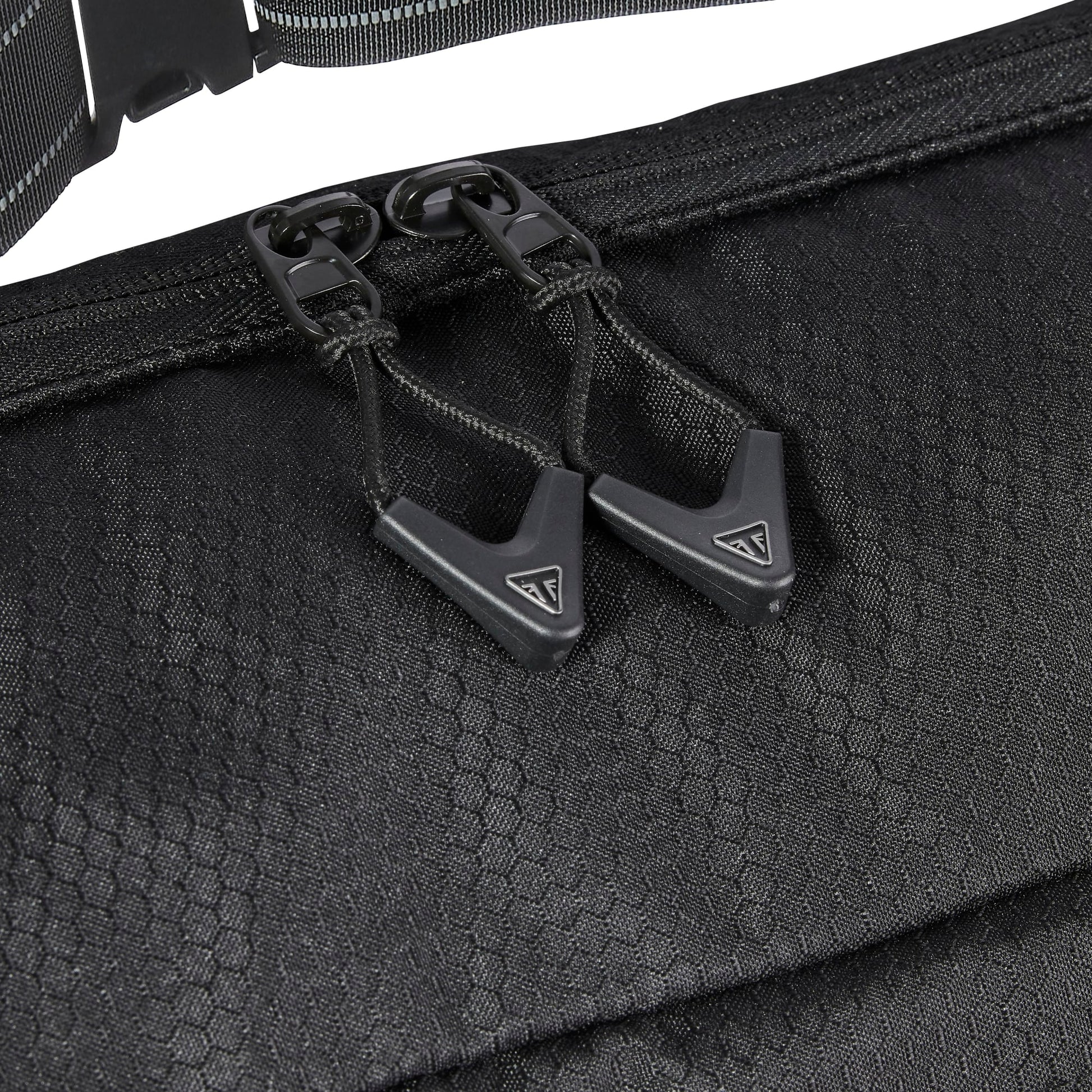 The black anodized carabiner secures the packing pouch to the bag when its unpacked. This bag folds into a compact pouch that easily fits into your bike's storage, when not in use.